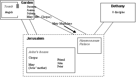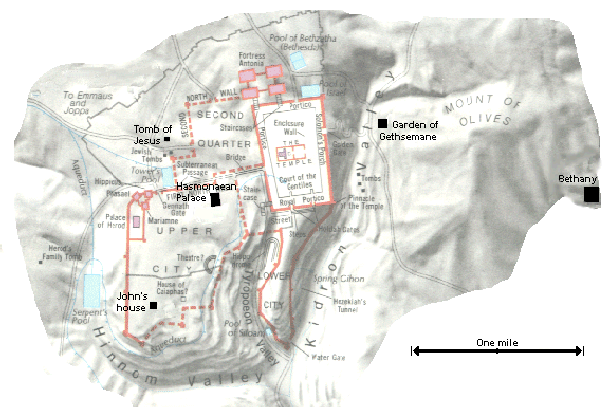 Joanna is with her husband in the old Hasmonaean Palace, residence of Herod Antipas. Also staying there is her friend Susanna. Most of the disciples have fled to Bethany. The rest are at Johns house in south Jerusalem, with the possible exception of Thomas, who may have gone further afield. |